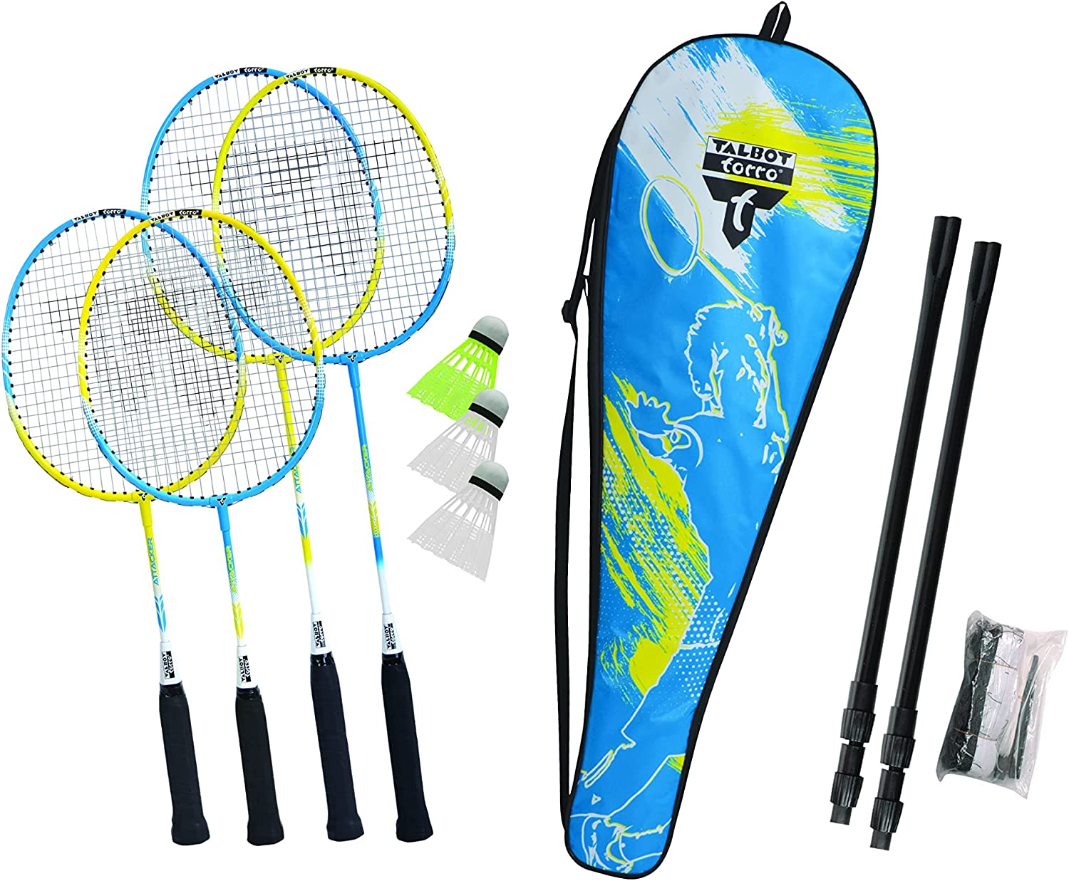 Die bekannte deutsch-britische Marke Talbot-Torro ist bekannt für seine grosse Auswahl an wertigen Badminton-/Federballsets. Auf ins gemischte Doppel mit dem Set Family. Das Family Set besteht aus 4 Badmintonschlägern (zwei Schläger in verkürzter Junior Variante 53 cm und zwei normale Erwachsenen-Schläger 66,5cm), 3 Kunststoff-Federbällen mit Korkfuß und einem höhenverstellbaren Teleskop-Netz. Durch die verstellbare Höhe der Teleskop-Pfosten kann das Netz auch individuell an Kindergrößen angepasst werden. Die Junior-Schläger sind speziell auf die Bedürfnisse von Kindern ab 5 Jahren zugeschnitten. Die kürzeren (53cm) Rackets haben einen kleineren Griff und ermöglichen den Kids ein besseres Handling. So können sie die Schlagtechniken leichter und schneller erlernen. Und durch die frischen Farben der Rackets sind auch die ganz Kleinen schon voll im Trend. Die Schläger sind in robuster Bauweise aus gehärtetem Stahl gefertigt, geschlossenes T-Stück und hart-bespannte multifile Saite. Die Kunststoff-Federbälle werden geschützt in einer Dose geliefert. Zur Netzgarnitur gehören neben dem Netz die Pfosten, Abspannschüre und Heringe. Das komplette Set kommt mit Spielanleitung in einer wertigen Tragetasche mit Reißverschluß und längenverstellbarem Träger. Talbot-Torro wurde u. a. von dem Britischen Badminton-Champion Derek Talbot gegründet, der sich nach seiner aktiven Zeit als Spieler sehr stark engagierte, dass Badminton olympisch wurde. Talbot-Torro ist heute klarer Marktführer im Freizeit-Badminton-Segment in Zentraleuropa und bietet ein exzellentes Preis-Leistungs-Verhältnis.