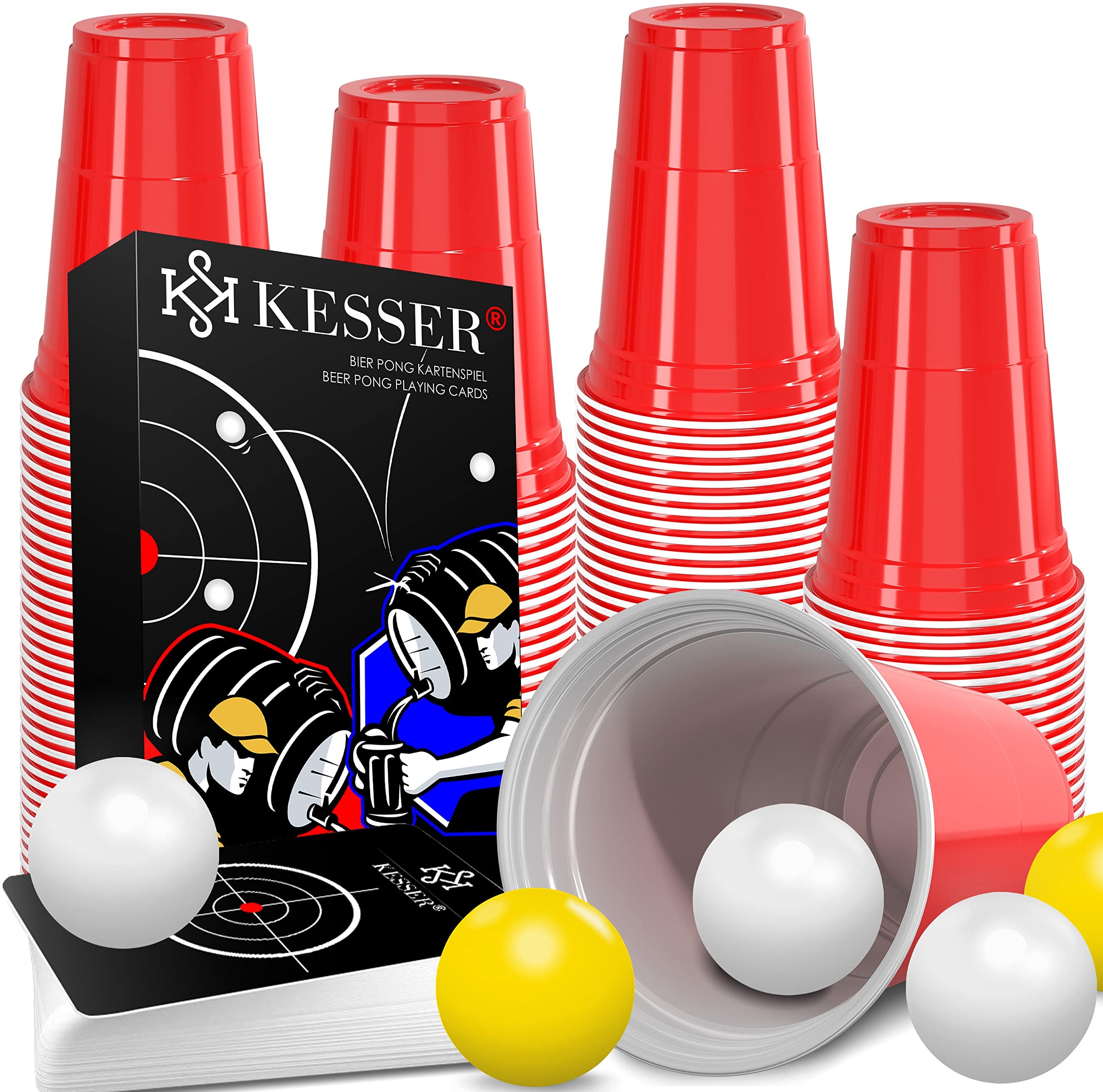 | Name | KESSER® Beer Pong Becher Set Mit Kartenset 54 Karten, Bierpong Trinkspiele Partybecher Sets (100 Becher 473ml + 10 Bällen) Bierpong Cups Spieleabend Geburtstag Partyspiel Hochzeit |