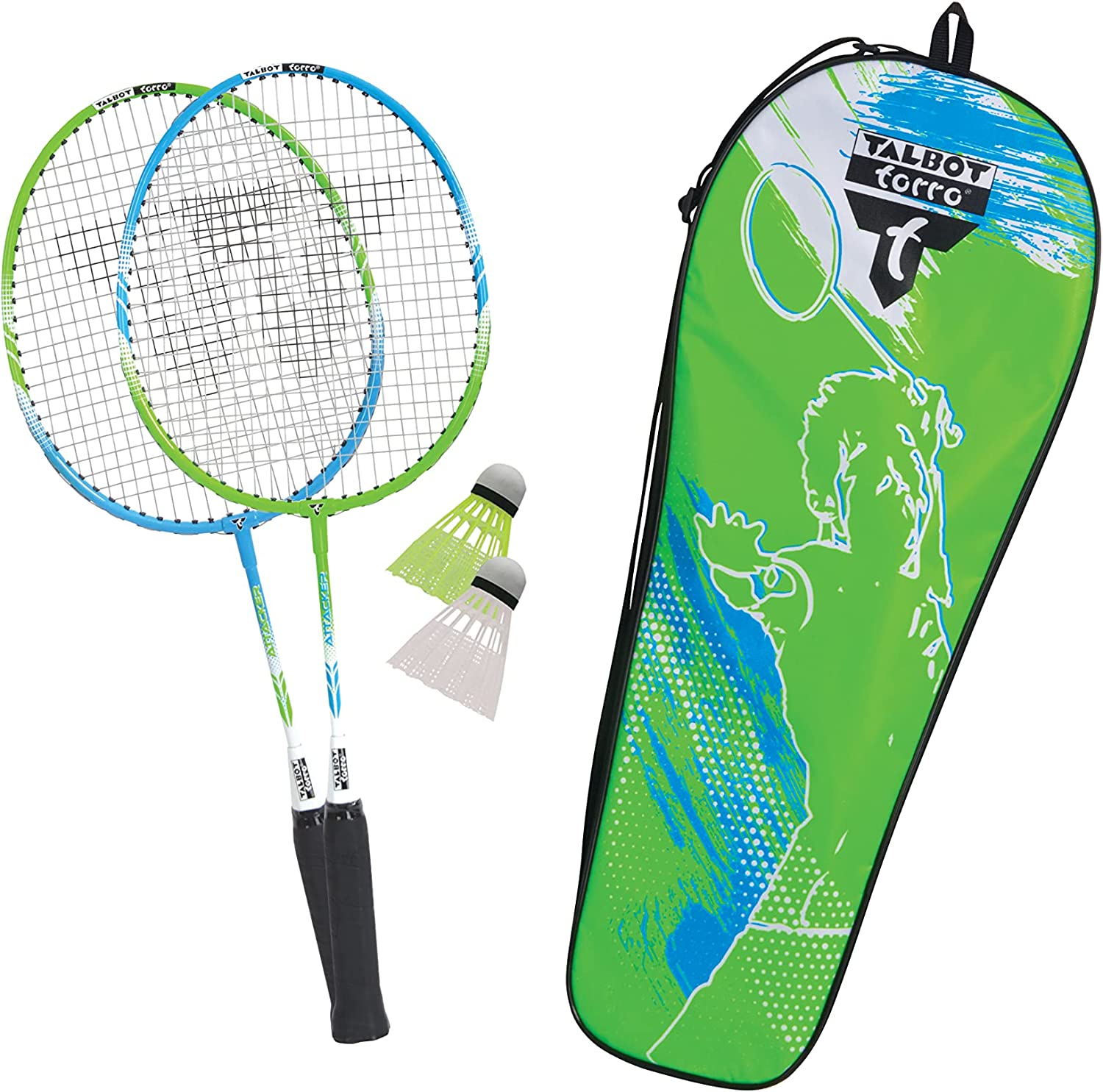 Hole dir jetzt das beliebte Kinder-Federballset 2-Attacker Junior der bekannten deutsch-britische Marke Talbot-Torro. Talbot-Torro ist bekannt für seine grosse Auswahl an wertigen Badminton-/Federballsets. Das Set 2-Attacker Junior besticht durch 2 verkürzte robuste Kinder-Schläger aus gehärtetem Stahl, die nur 53cm lang sind (und damit 13,5cm kürzer als normale Schläger mit 66,5cm Länge) und einen kleineren Griffdurchmesser haben für die Kinderhand. Kopf und Schaft sind durch ein hochwertiges, stabiles, haltbares und komplett geschlossenes T-Stück verbunden, das sich nicht aufbiegen kann. Die sehr haltbare elastische Lawntex Saite 0,8mm ist hart bespannt, damit der Ball nicht in der Saite stecken bleiben kann. Mit dabei sind 2 Kunststoff-Federbälle mit Korkfuß in formstabilder Dose zur sicheren Aufbewahrung (keine plattgedrückten Bälle). Alles verpackt in wertiger Tasche mit Reißverschluß und längenverstellbarem Tragegurt incl. Spielanleitung. Talbot-Torro wurde u. a. von dem Britischen Badminton-Champion Derek Talbot gegründet, der sich nach seiner aktiven Zeit als Spieler sehr stark engagierte, dass Badminton olympisch wurde. Talbot-Torro ist heute klarer Marktführer im Freizeit-Badminton-Segment in Zentraleuropa und bietet ein exzellentes Preis-Leistungs-Verhältnis.