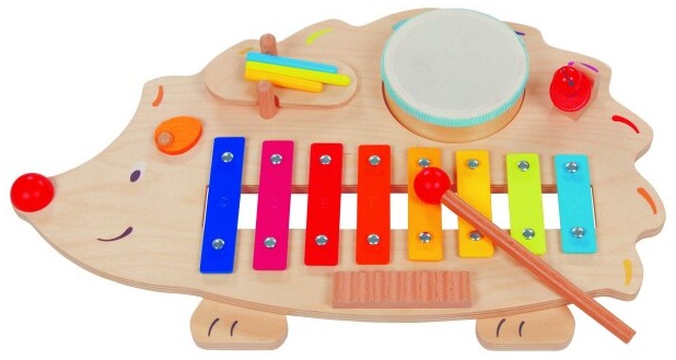 Spielwaren Der goki Klangigel. Eine wunderschöne, attraktive Klangstation für alle musikalischen Einsteiger. Für das ansprechende emotionale Umfeld der einzelnen Klangelemente sorgt zweifellos der freundlich dreinblickende Holz-Igel. Das zentrale Klangelement ist das Xylophon mit seinen harmonisch aufeinander abgestimmten farbigen Klangplatten aus Metall. Während die kleine Trommel durch ihren angenehmen Klang überzeugt, bringt sie Schlagwippe mit ihren 3 Rundstäben schon ein wenig mehr Power in den Sound. Die Metallglocke wirkt nur vordergründig unscheinbar, hat sie doch für Kinder eine ungeheure, fast schon magische, Anziehungskraft. Und über das Riffelbrett darf uneingeschränkt und nach Herzenslust im Rhythmus geratscht werden. Der Klangigel ist als Beschäftigungsboard, Instrument und Spielzeug ein wahres Multitalent und sooo unendlich faszinierend für die kleinen Musikanten.