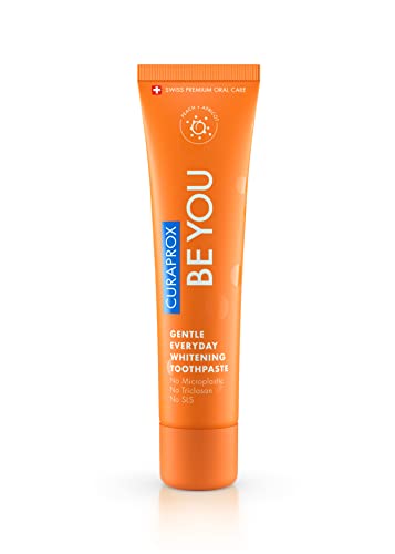 in ZahnpastaCuraprox Be You Pfirsich Whitening-Zahnpasta mit Geschmack von Pfirsich und Aprikosemit Menthol, vegan, 950 ppm Fluorid, RDA 50, orange, 60 ml
