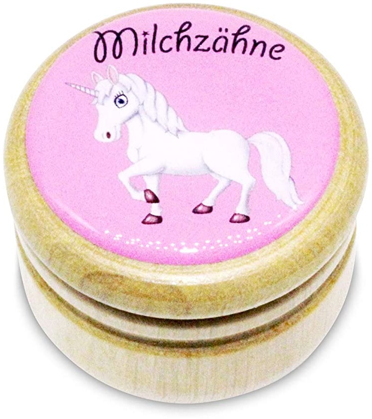 in ZahnpflegeMilchzahndoseZahndose Milchzähne Bilderdose aus Holz mit Drehverschluss in diversen Motiven für Jungen und Mädchen mit Drehverschluss 44 mm (Einhorn) -Made in EU-7011