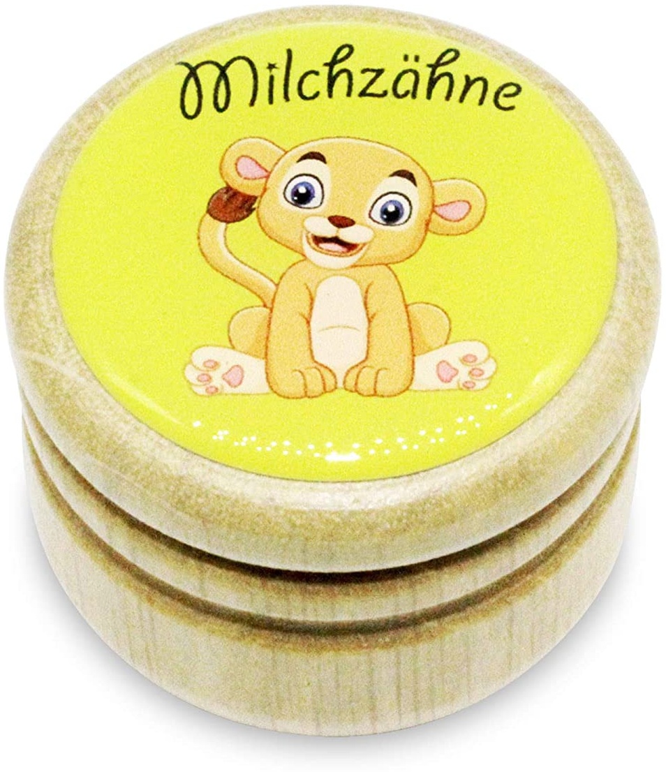 in ZahnpflegeMilchzahndoseZahndose Milchzähne Bilderdose mit diversen Motiven aus Holz für Jungen und Mädchen mit Drehverschluss 44 mm (Löwe)