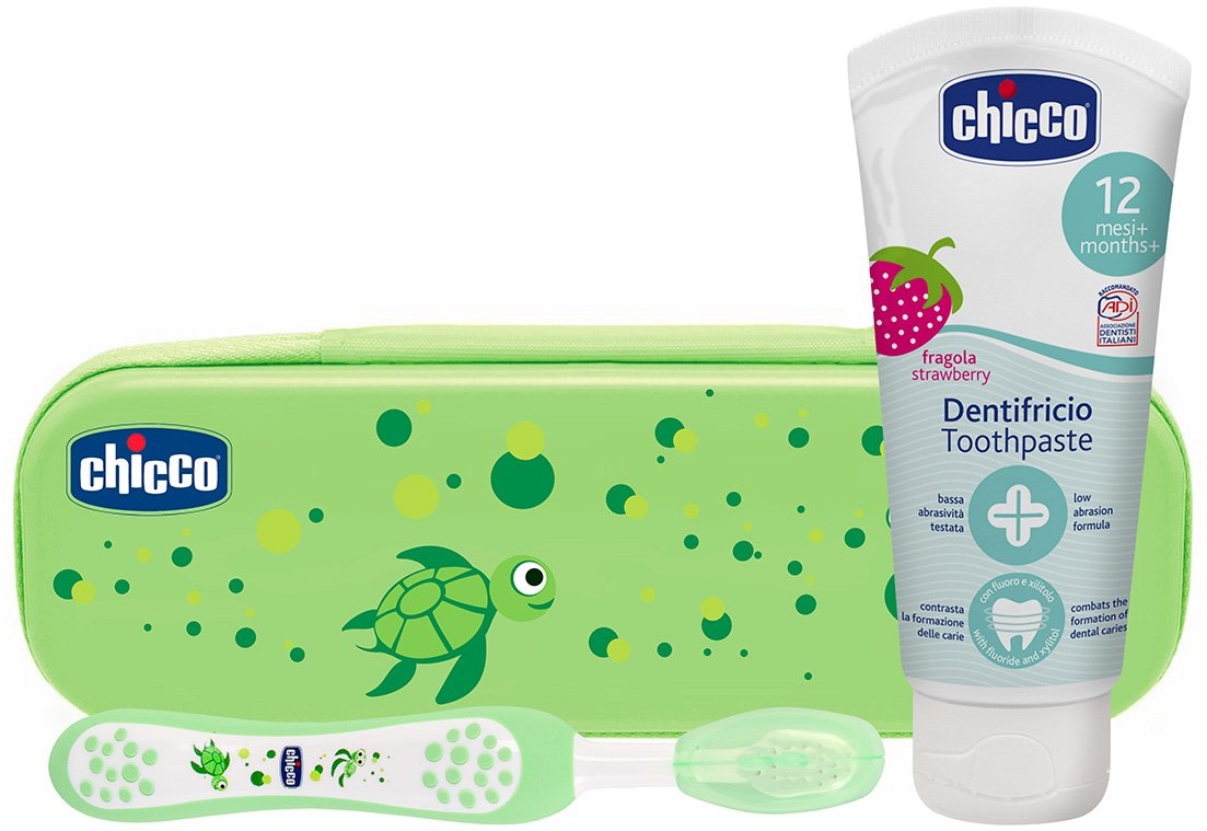 - Das Chicco Oral Set enthält eine Zahnbürste und eine Kinderzahnpasta mit Erdbeergeschmack, die speziell für Kinder ab 12 Monaten entwickelt wurde.