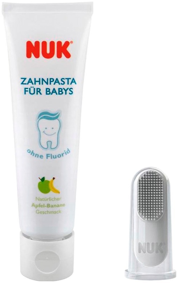 in ZahnpflegeNUK 10256396 Mundpflege-Set mit Baby-Zahnpasta und natürlichem Apfel-Banane Geschmackincl. Fingerzahnbürste, BPA frei, ohne Fluorid, 1 Stück