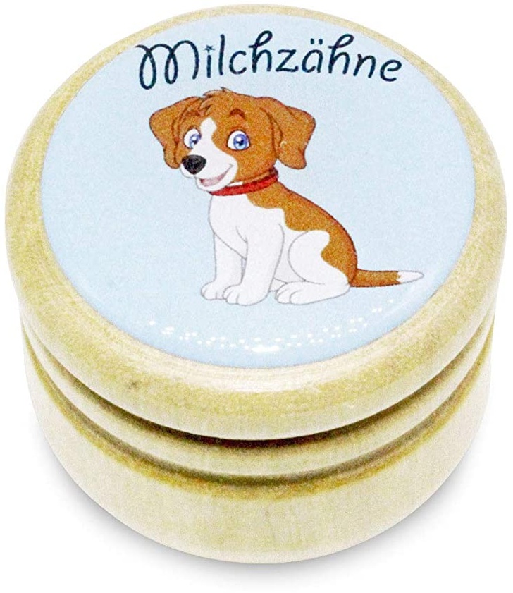 | Name | Milchzahndose, Zahndose Milchzähne Bilderdose mit diversen Motiven aus Holz für Jungen und Mädchen mit Drehverschluss 44 mm (Hund) |