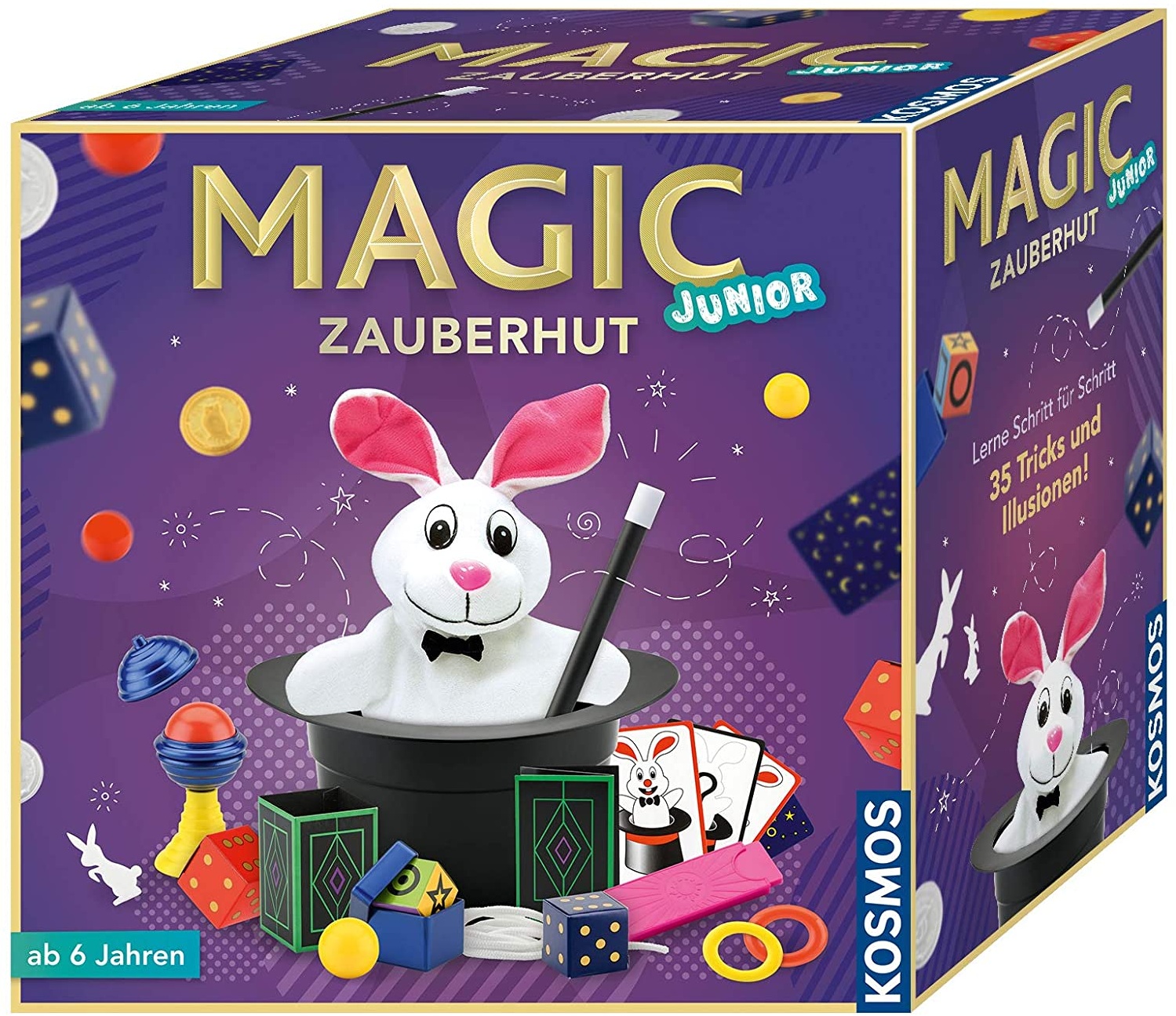 Magic Zauberhut Der Einstieg in die Welt der Magie und Zauberei! Mit dem Zauberhut und dem Kaninchen sowie den anderen Zauber-Utensilien können 35 Zaubertricks erlernt und vorgeführt werden. Die farbige Anleitung zeigt mit vielen Bildern in drei Schritten, welche Zauberutensilien benötigt werden, wie der Trick vorbereitet und wie er vorgeführt wird. Mit etwas Übung ist Zaubern kinderleicht und die Tricks gelingen, sodass das Publikum staunt. Spielmaterial: 1 Zauber-Zylinder aus Kunst-stoff, 1 Plüsch-Kaninchen, 1 Zauberstab, 2 gebogene Hasenkarten, 1 Röhre mit Loch, 3 magische Ringe, 1 Würfelsäule, 1 Zauberseil, 1 Ball, 1 Zauberpokal, 4 Würfel, 1 Hasentunnel, 1 Röntgen-Box, 5 Karten, 1 Kartenkassette, 5 Münzen, 1 Becher, 5 Schaumstoff-Hasen Warnhinweis: Achtung! Nicht für Kinder unter 36 Monaten geeignet Achtung! Enthält verschluckbare Kleinteile. Erstickungsgefahr. Bei Sortimenten und Großpackungen gilt der angegebene Preis pro Stück. Eine Auswahl ist nur bedingt möglich!